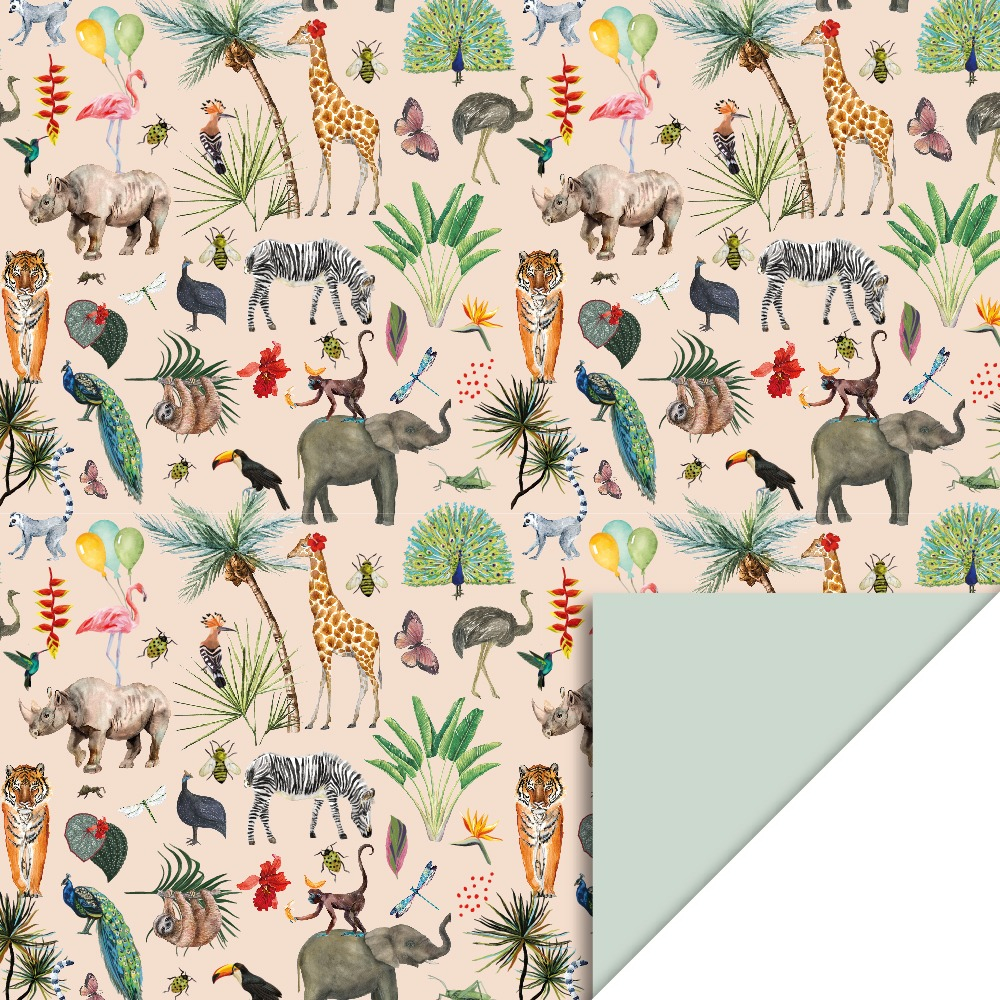 Enig dit papier met veel jungledieren. Formaat 70cm x 3 m. Prijs is per rol.