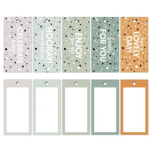 Deze prachtige cadeaulabels maken je cadeautje helemaal af! Ze zijn sierlijk en ingetogen. En voorzien van het mooie nieuwe dessin Random Spots. De cadeaulabels zijn dubbelzijdig bedrukt. Op de achterzijde is ruimte om iets voor de ontvanger te schrijven. Set van 5 verschillende labels.