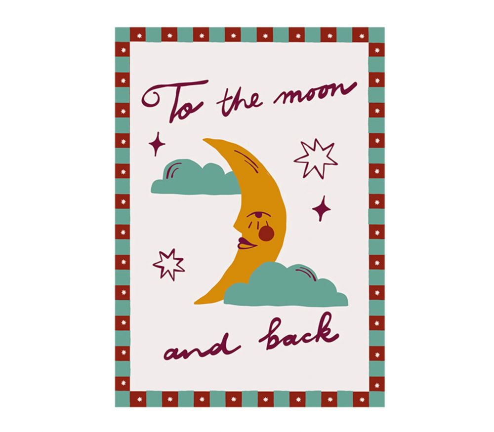 Lief kaartje met maan en tekst To the moon and back. All the luck in the world. A6 formaat.
