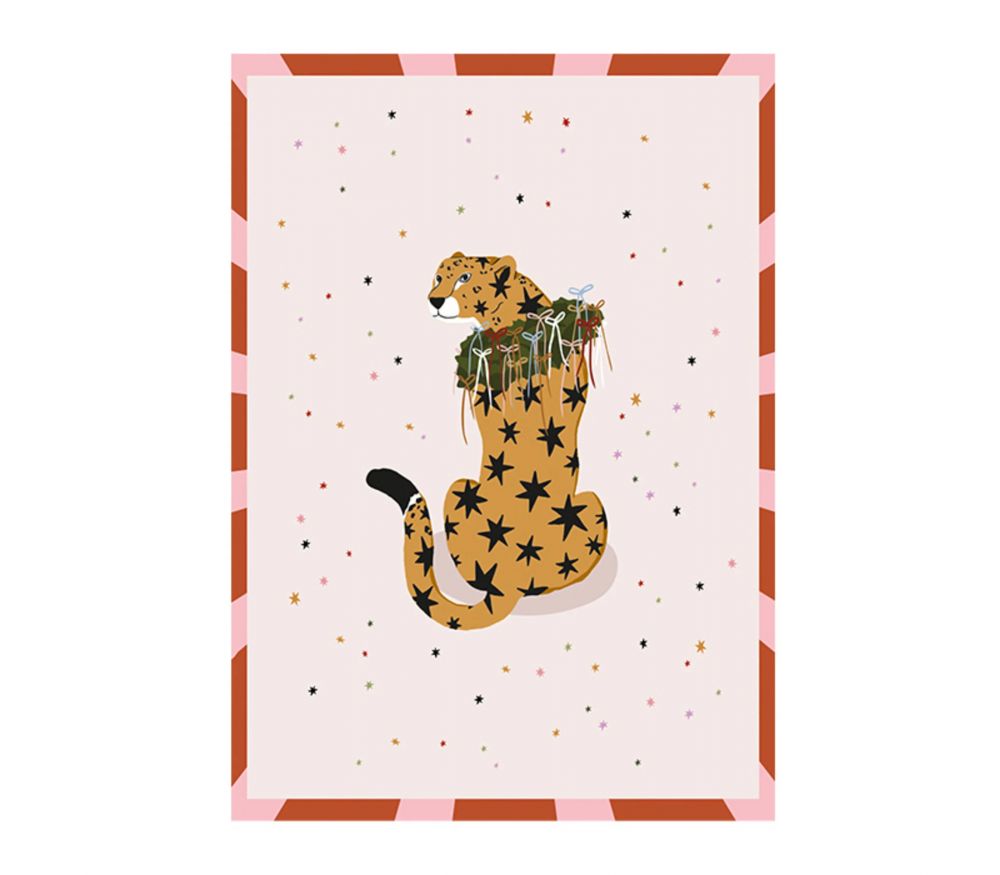 Geinig kaartje voor kerst, met luipaard in kerstsfeer. All the luck in the world. A6 formaat.