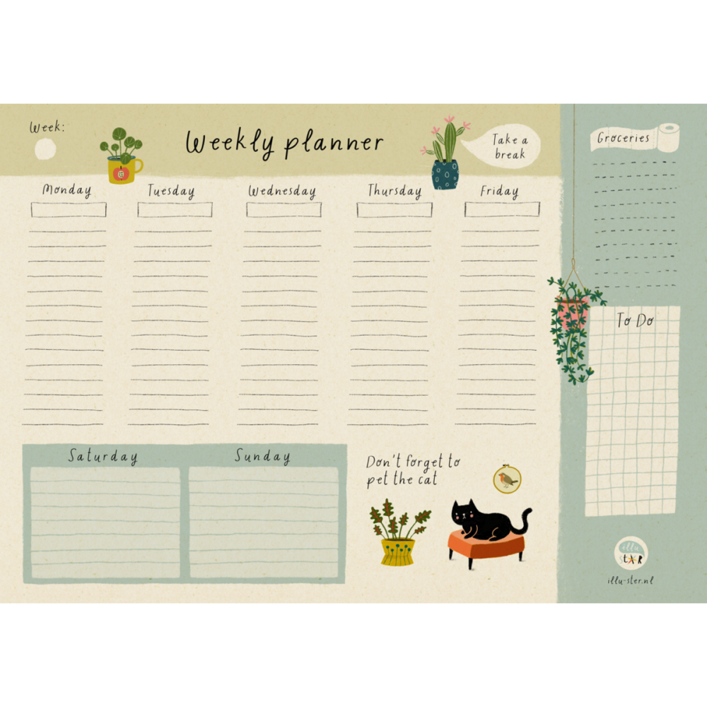 Leuke en praktische weekplanner voor al je klusjes en afspraken. Gemaakt van landbouwafvalpapier, er zijn geen bomen beschadigd. Illu-ster.