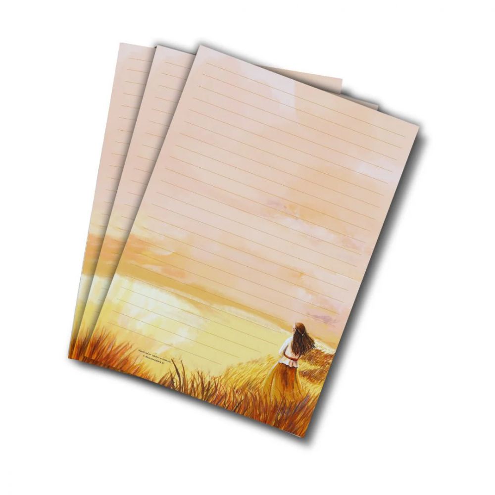 Mooi rustig plaatje, door de velden. Te gebruiken als briefpapier of notitieblok. Formaat A5 - dubbelzijdig bedrukt - 120g papier - ong. 50 vellen per blok - FSC gecertificeerd - gemaakt in de EU. Esther Bennink.